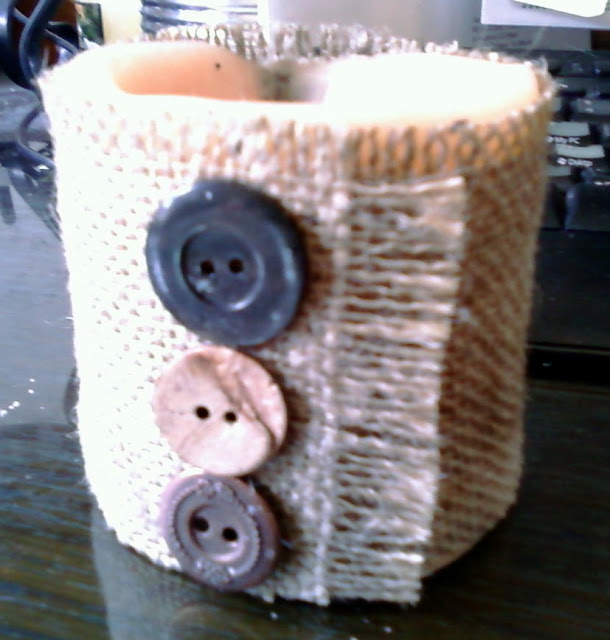 See, I’ve got this candle in the boys bathroom that has the most wonderful vanilla scent. But the candle is old and ugly. I grabbed some burlap left over from my window curtains I made. I haven’t posted about these yet.