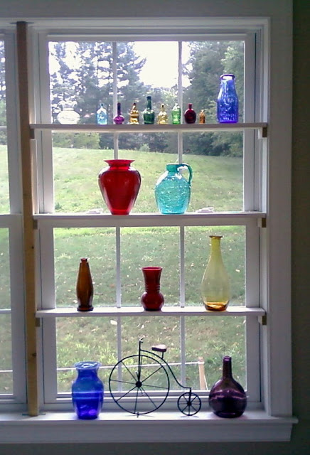 I have a sunroom that has a bank of three windows. These windows look out to a hill behind our house. The previous tenants took all the window treatments and since we didn’t need curtains for privacy purposes, I decided to leave the windows untreated–nekkid, so to speak. With all that natural light pouring in, though, I quickly decided these windows would make a great display area for my growing glass collection.