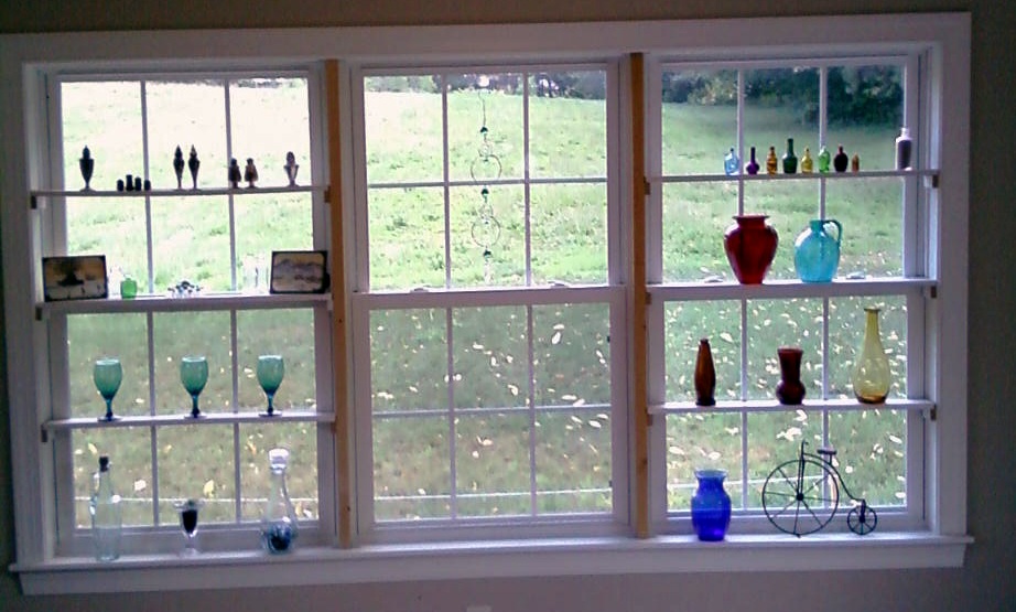 I have a sunroom that has a bank of three windows. These windows look out to a hill behind our house. The previous tenants took all the window treatments and since we didn’t need curtains for privacy purposes, I decided to leave the windows untreated–nekkid, so to speak. With all that natural light pouring in, though, I quickly decided these windows would make a great display area for my growing glass collection.