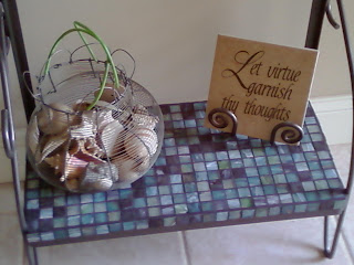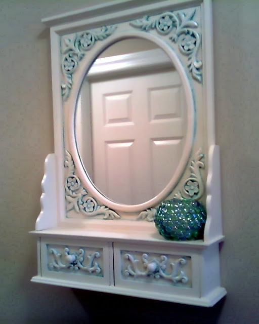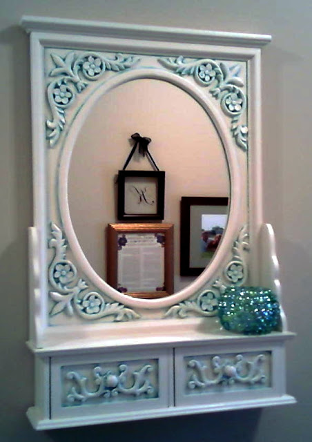 My little mirror shelf was another victim of this move. I bought the shelf when I lived in Boise and my Mom and I went out garage saling one day. Mom came away with a ton, but I just had the $4 shelf. Hubs never liked the shelf and the fact that it sat in our garage the whole time we were in Idaho didn’t help. A piece of the frame around the mirror needed re-gluing and since I never really had a good spot for the shelf, this remained buried under a ton of crap in the garage an unfinished project of mine.