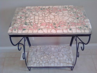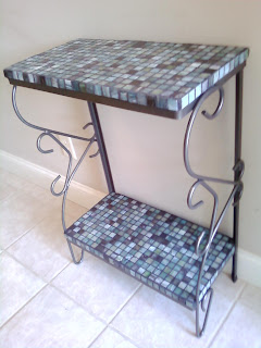 Several years ago, back when my kids were all living at home and we were dumb enough to do a paper route, I came upon a little fish tank stand that one of our customers was throwing out. I scooped up the stand as I was itching to try my hand at a mosaic table out of plates. My little stand was a perfect base for this project. I promptly spray-painted it black, attached a wood base to each shelf area and started hitting the thrift stores for the perfect plates to break up.