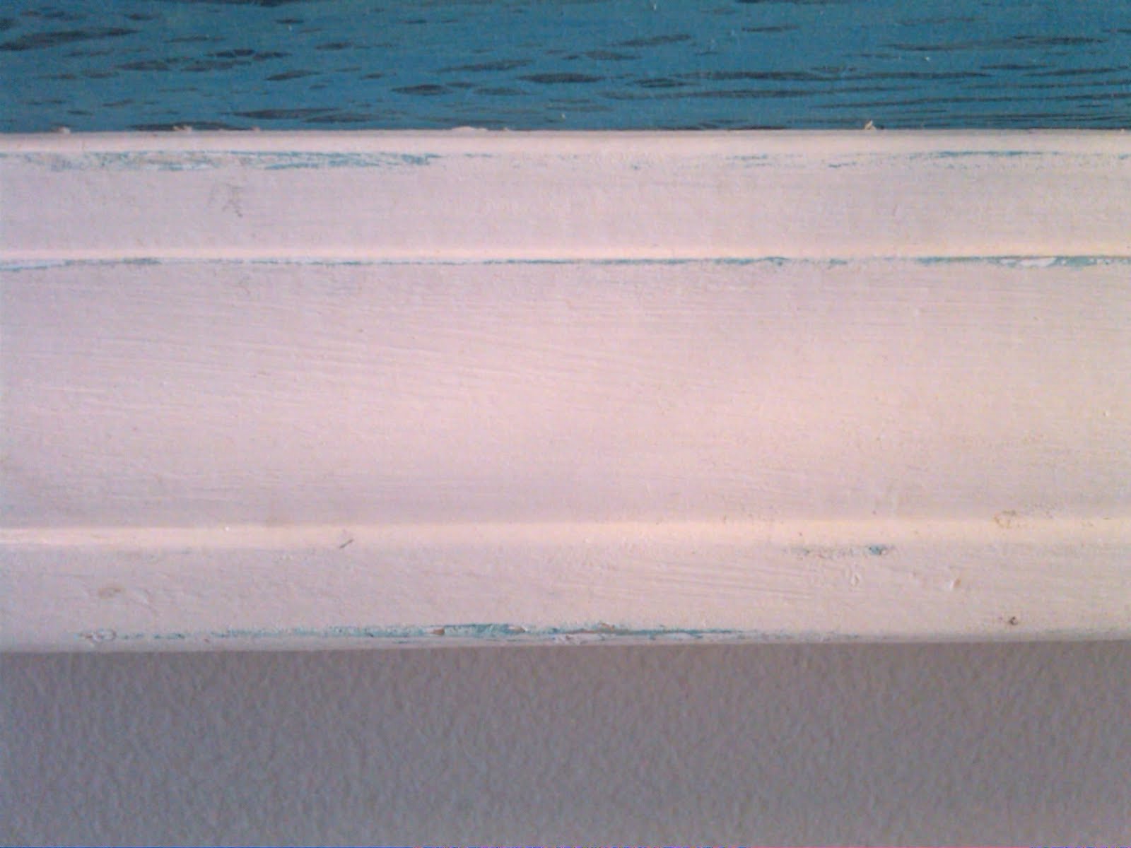 Next, I bought some casing and cut it to frame the board. I painted the casing with the green I used to tone down the black. Then I painted over it in a cream and distressed the edges. I just did a light distressing. I have all the fun tools, like a chop saw, electric palm sander and a pneumatic nail gun, so this process is pretty painless for me.