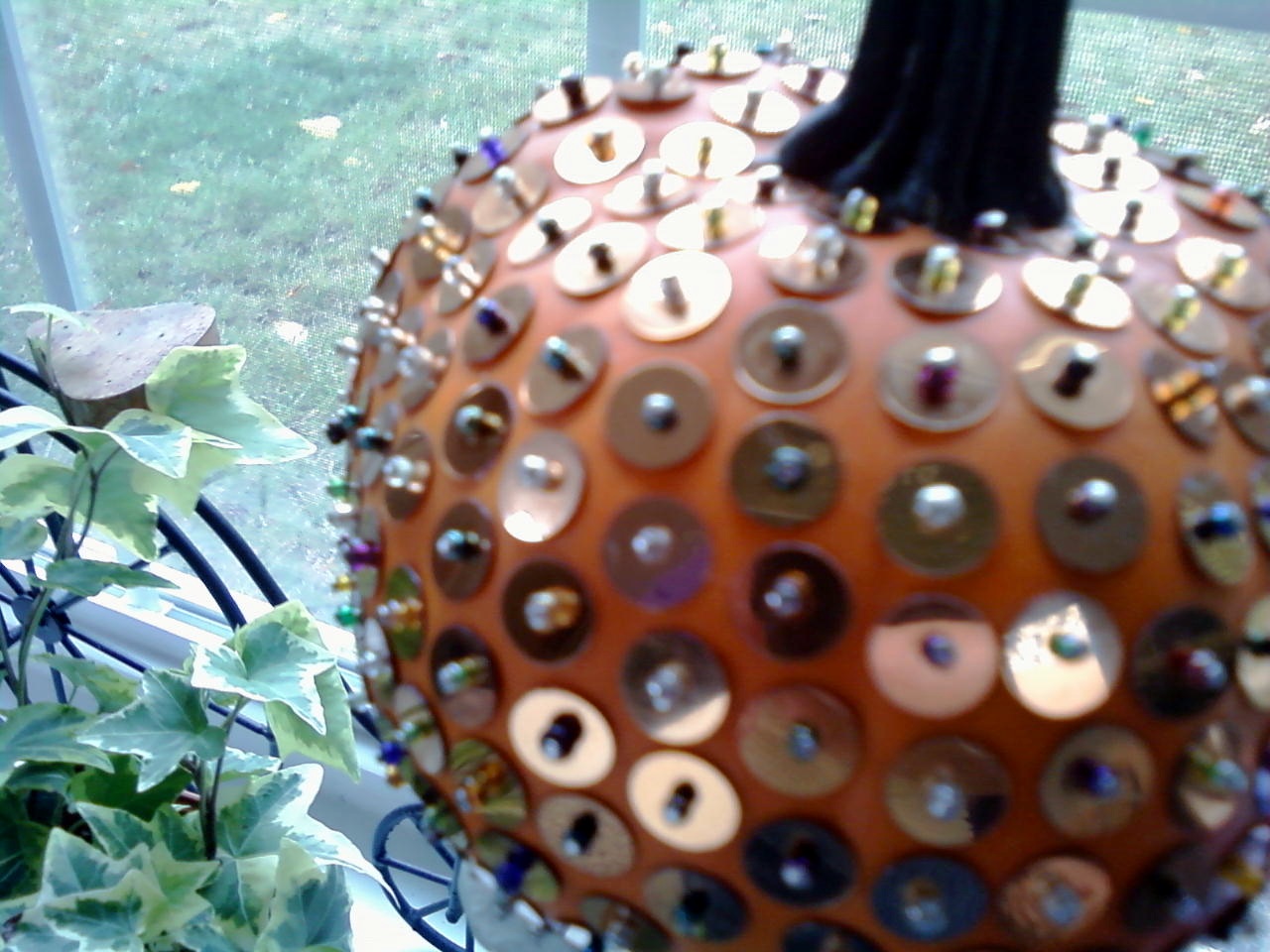 Years ago I bought these sequins at a craft store for $1.00. Every year I’ve wanted to use them, but I never found the right pumpkin for them. Finally, this is the year! Next, I broke out my straight pins and some seed beads and went to work.