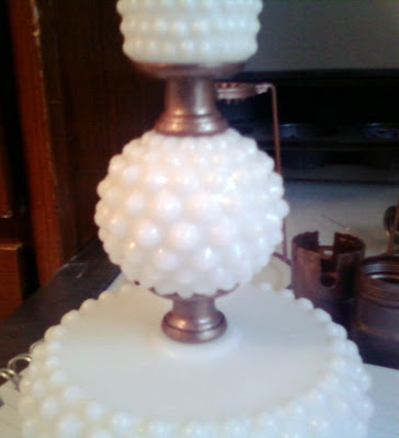 The cord was so old, it was brittle and breaking when bent. The metal was rusty in some parts and shiny in others. While I really liked the juxtaposition of the rust with the milk glass, it wasn’t uniformly rusty and that was irksome.