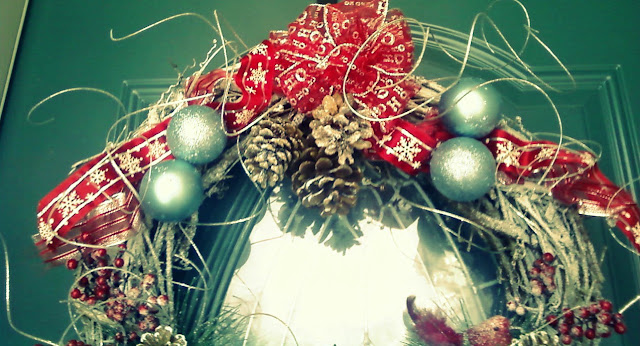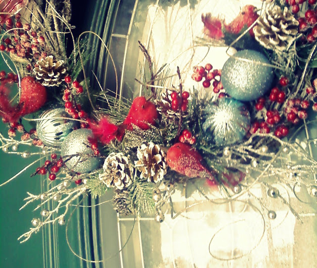 The silver twirlies, the big pine cones up top and bead things were also from my old display. The cardinal picks, the red berries and the froufy ornaments I bought this year. I also bought a can of snow spray to dust all the pieces. I hot glued down the ornaments, the bow tails and the cut berry stems. Everything else I slid into the grapevine wreath between the branches.