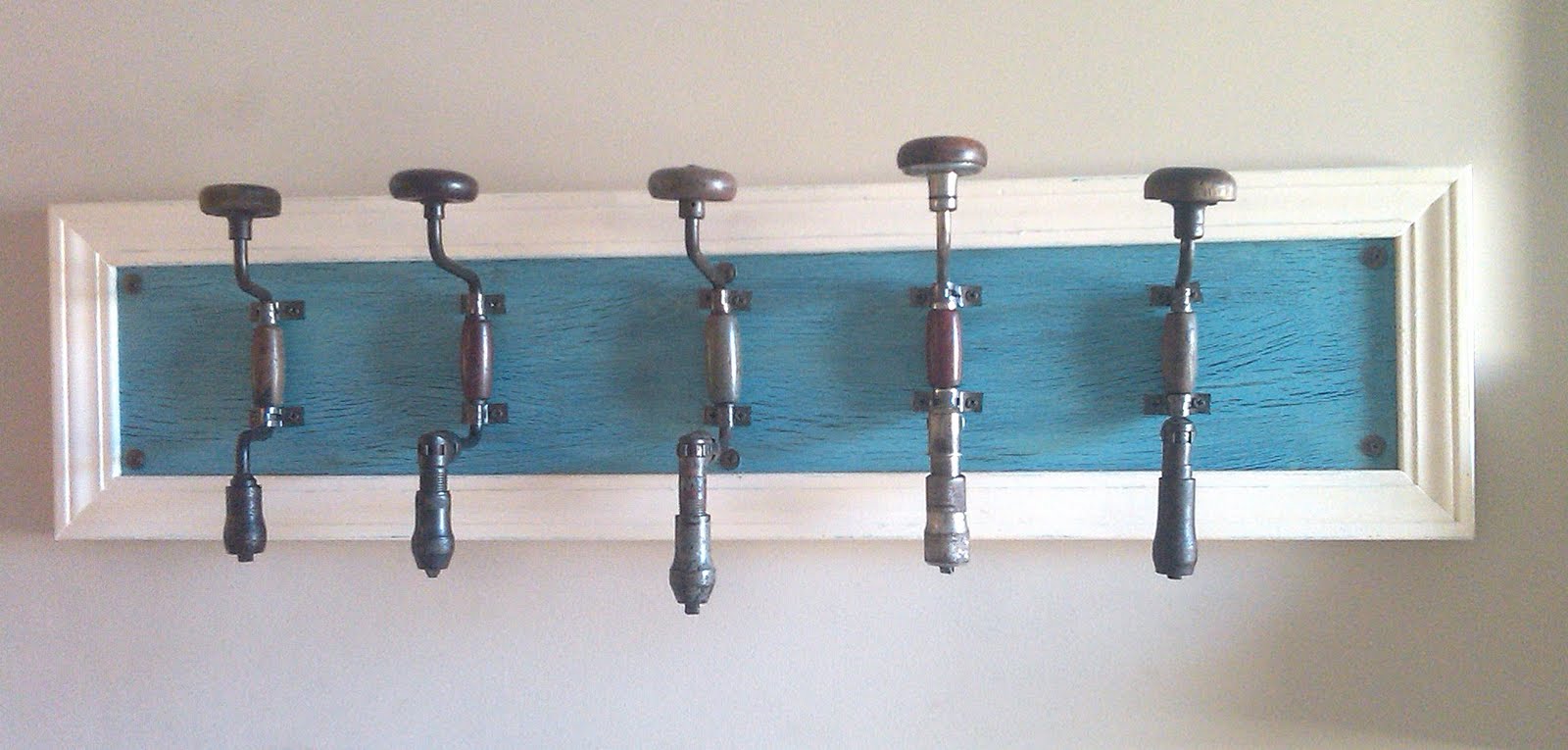 The mirror shelf, the entry way table (small amount of blue tile you see in the photo above), the topiary – I didn’t do a post on this one. Do you really need to see me shoving plastic boxwood pieces into styrofoam? and the candle globe were also projects of mine. After months of use on the coat rack, I’m going to need to find a different support for the braces. The pipe strapping is not tight enough and the weight of the coats is starting to stress the strapping, but I love both the form and the function of this coat rack.