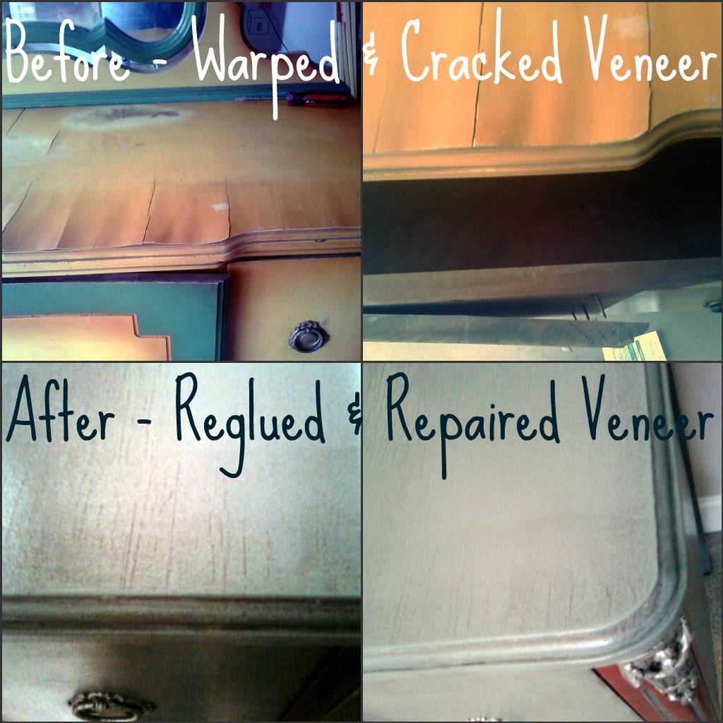 Here’s a close-up of the damage to the dresser and after I fixed it.