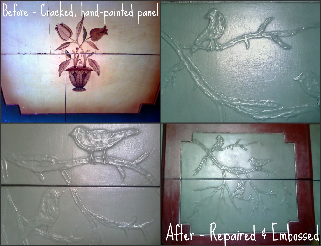 I embossed the design on the front of the dresser using a shrink-proof drywall spackle. I drew the birds and branches on the front panel and then embossed my design (edited: I painted the wall fix on with a brush to make the embossed design). The glaze settled into the dimensions of the embossing and gives it some beautiful definition, which I have yet to pick up on my camera.