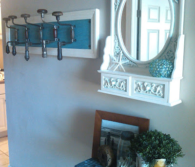 The mirror shelf, the entry way table (small amount of blue tile you see in the photo above), the topiary – I didn’t do a post on this one. Do you really need to see me shoving plastic boxwood pieces into styrofoam? and the candle globe were also projects of mine. After months of use on the coat rack, I’m going to need to find a different support for the braces. The pipe strapping is not tight enough and the weight of the coats is starting to stress the strapping, but I love both the form and the function of this coat rack.