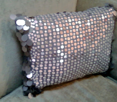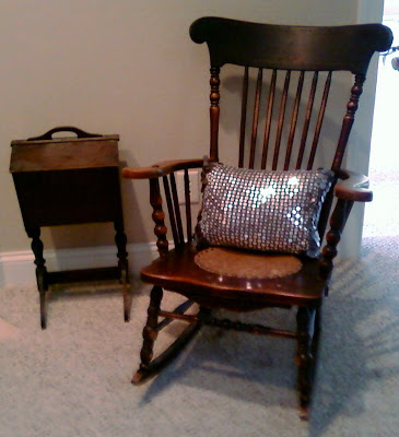 I took some of the large sequins from the part I cut off and filled in on the top where I sewed the pillow shut. Here’s my latest bit of Frouf for my house. Here she is, Blinging up Grandma Bourne’s rocking chair.