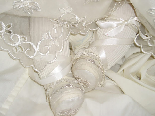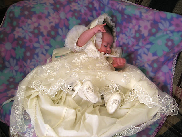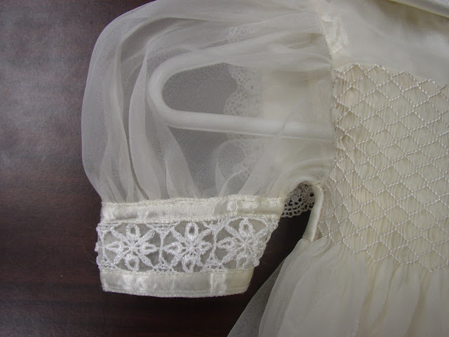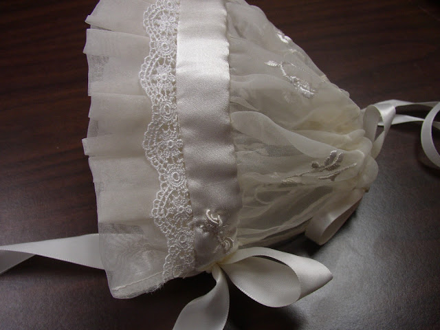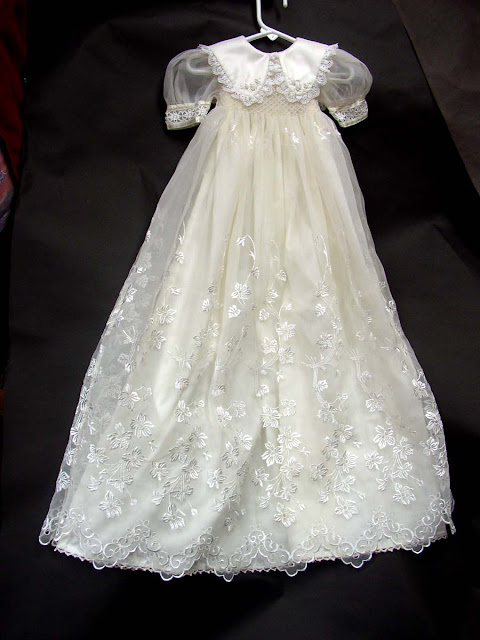 I was especially happy with the sleeves. The lace on the bottom of the sleeve, comes off the bottom of the sleeve of the original dress. I just cut it off and made it a cuff for the baby gown. I used the same sleeve pattern from the dress I made for Karen and modified it to fit this gown. It had a satisfying amount of pouf to it.