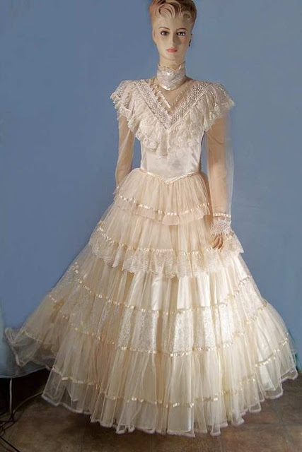 I went to the Salvation Army, and this particular store was about as dark and dreary and grungy of any store I’ve ever been into. I always felt the need for a shower after visiting that store. However, they occasionally had some real finds and on one trip I came upon a vintage Jessica McClintock Wedding gown.I failed to take a before picture, but the top looked a lot like this: