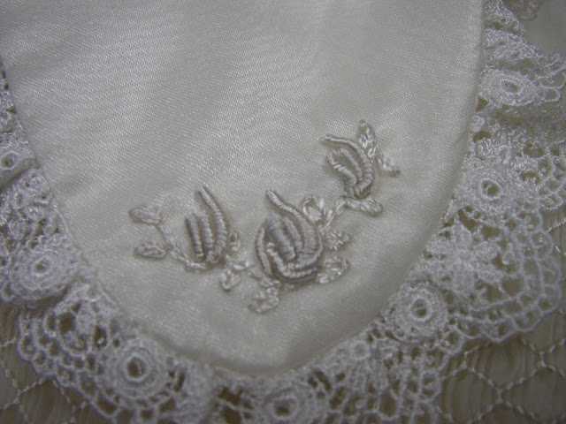 The collar is chiffon over satin with the lace edging. It’s no joke sewing all of those slippery layers and I didn’t get it right. I didn’t realize it until the dress was almost finished and after all the hours I put into the dress, I just didn’t want to go back and fix it. I wish I had. Maybe some day, I’ll fix it for my grand-nieces.