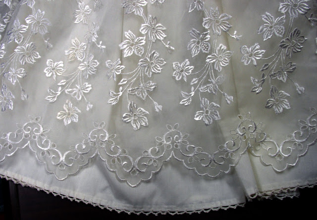 The bottom was lace chiffon over an acetate underskirt, but the skirt was lightly embroidered at the top and got more detailed at the bottom. The acetate was yellowed and falling apart. The dress had multiple rust spots. It was brownish with dirt and dust. It smelled badly. It was $12.