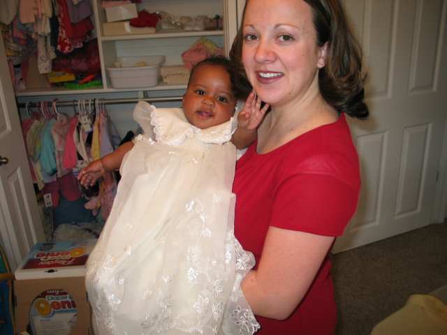 Here’s beautiful Miss Cuteness in her dress. Cuteness was almost 9 months old by the time my brother, Jon, was able to get her from the orphanage. Shari is eight months pregnant, which is conveniently disguised by the length of this dress. I know I could have made it shorter, but I loved the lace so much I just couldn’t bring myself to do it.