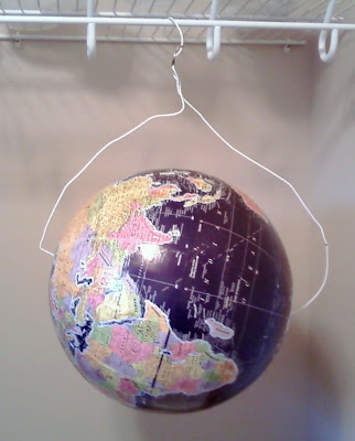 I opened up a wire hanger and then hung it over my laundry room sink to paint it. You can kind of see where I outlined the continents with some white paint.