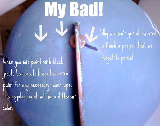 When it finally sank in to my purty lil’ head that I’m kind of Attention-Deficit and just wanted this project done already, I busted out the paint and got to work. I bought some white grout to add to the paint for this project, but it has since gone missing. I suspect a super-helpful husband had a hand in the grout’s relocation. Fortunately, I had some black grout on hand, and that seemed to do the trick just fine. If you don’t know, adding grout to your paint will make the paint into chalkboard paint.