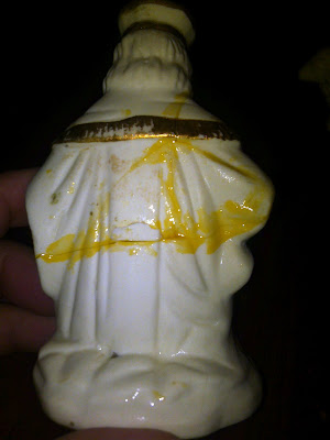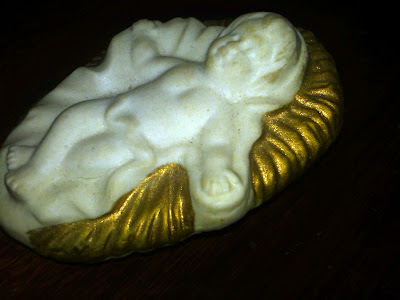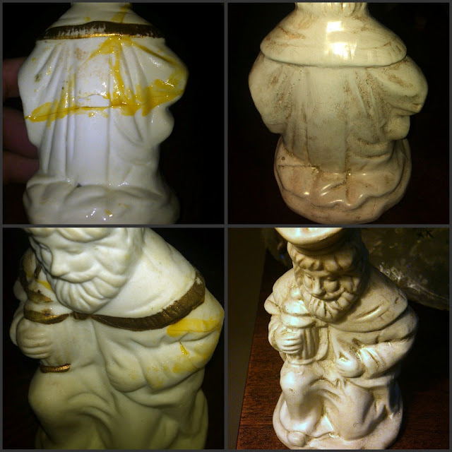 Baby Jesus needs a bath. Still, cleaning is only going to go so far. While the gold is very bright and garish in these photos, in real life, it was dingy and dull. Not pretty at all.