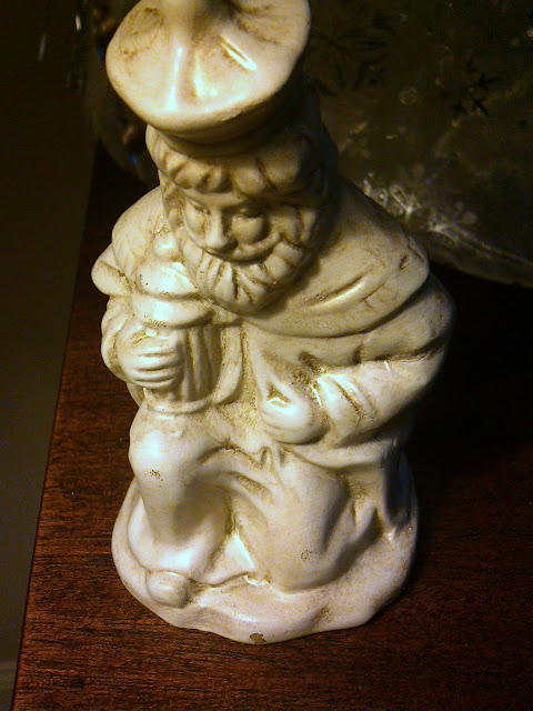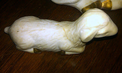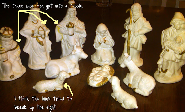 Apparently, rough-housing near the Nativity is a family tradition. I suspect one of the kids got too rough around the Nativity and Wood Glue was the only glue to be found at the time. I clearly was not called in to consult on this repair job. I do not even remember this event. I looked a little closer at the set. Not only were my wise men in need of love, but baby Jesus has suffered over the years.